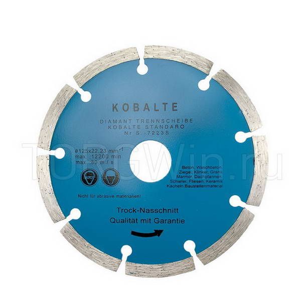 Алмазный диск "Kobalt", сегментированный, имеет параметры: диаметр 125 мм, посадочное место 22,23 мм. Изделие произведено из прочной стали, его поверхность поделена на сегменты, что улучшает качество резки и служит дополнительным охлаждением. Используется для сухой резки гранита, мрамора, керамики, бетона и других материалов.