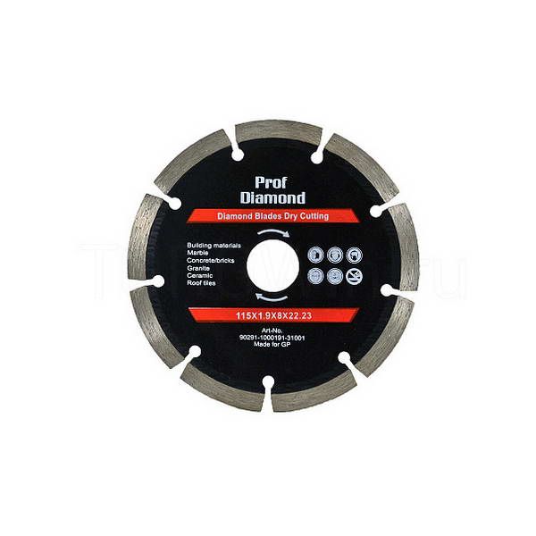 Алмазный диск "Prof Diamond" диаметр 115 мм, посадочное отверстие 22.23 мм, высота режущей кромки 8 мм, толщина диска 1.9 мм. Режущая кромка разбита на сегменты с компенсационными отверстиями по всей окружности. Диск выполнен из высококачественной стали и эффективно работает без принудительного охлаждения алмазного слоя. Применяется при работах с УШМ для сухой резки бетона, гранита, кирпича, камня и др. строительных материалов.