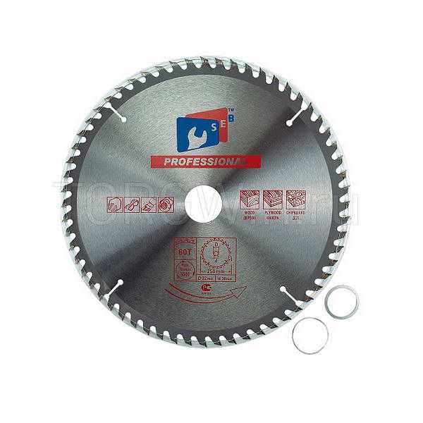 Диск пильный "SEB" по дереву, диаметр 250 мм, посадочный диаметр 32 мм, 60 зубов с победитовыми напайками. Предназначен для выполнения точных продольных и поперечных чистовых пропилов в мягкой и твердой древесине, прессованной слоистой древесине, фанере, ламинате и ДСП. Напаянные индуктивным способом твердосплавные переменные зубья с агрессивным углом резания обеспечивают одновременно быстрое и точное пиление. Чистота распила зависит от частоты зубьев - расстояния между ними - по окружности независимо от диаметра диска. Чем чаще зубья, тем чище распил. Основа выполнена из углеродистой стали, напайки на зубах из карбидно-вольфрамового сплава (победита).