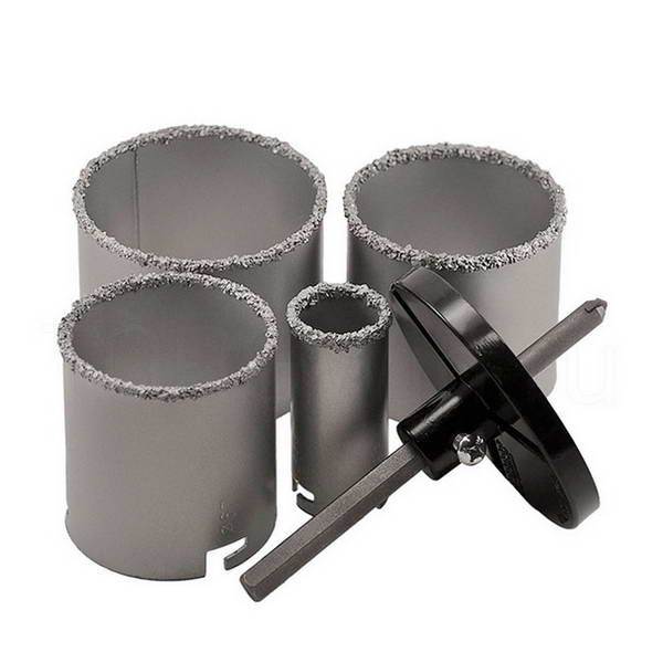 Коронки по керамической плитке (в наборе 4 штуки - размеры 33,53,67,73 мм), 6-гранный хвостовик. Предназначены для работы с электродрелями и перфораторами в безударном режиме. Используется для сверления отверстий в керамической и кафельной плитке, гипсокартоне, кирпиче и ячеистом бетоне. Изготовлены из качественной углеродистой стали с равномерным напылением карбид-вольфрамовой крошки. Применяются в сборе с центрирующим сверлом и державкой, которые есть в комлекте.
