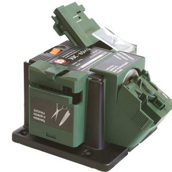 Ручной электрический многофункциональный заточный станок Калибр ЭЗС-65МФ предназначен для заточки свёрл, ножей, ножниц и лезвий. Заточка различных инструментов производится с помощью одного из 3-х зафиксированных в направляющих сменных блоков: для заточки свёрел; для заточки стамесок, зубил и для заточки ножей или ножниц. Для стационарного закрепления станка на верстаке (столе) шурупами или болтами, в основании имеются 4 монтажных отверстия. Коллекторный электродвигатель постоянного тока с двойной изоляцией обеспечивает максимальную электробезопасность.