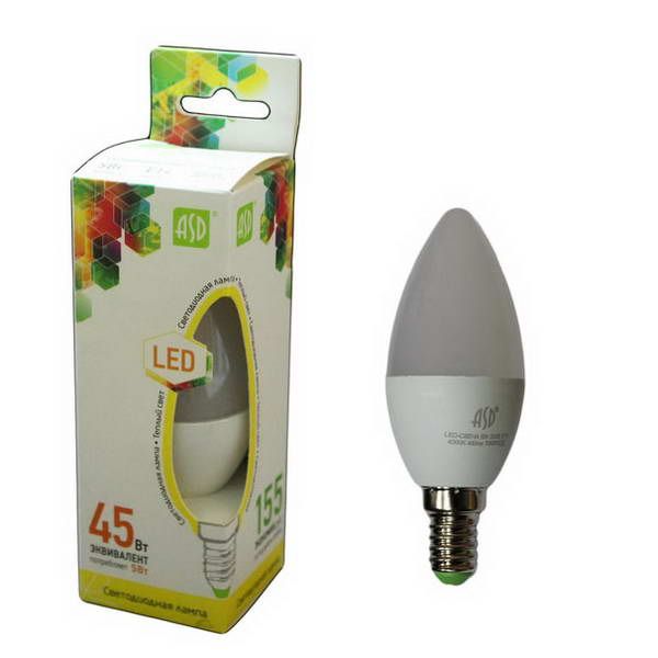 Лампа диод ASD Е14-5W 3000К 450Лм свеча С37