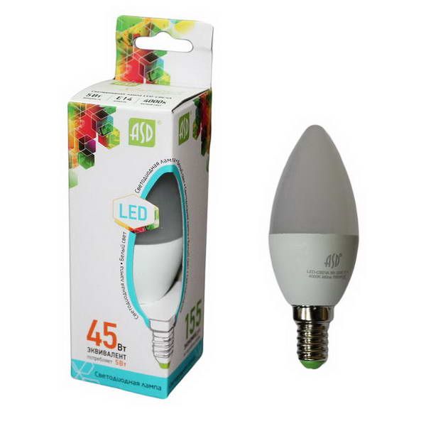 Лампа диод ASD Е14-5W 4000К 400Лм свеча С37