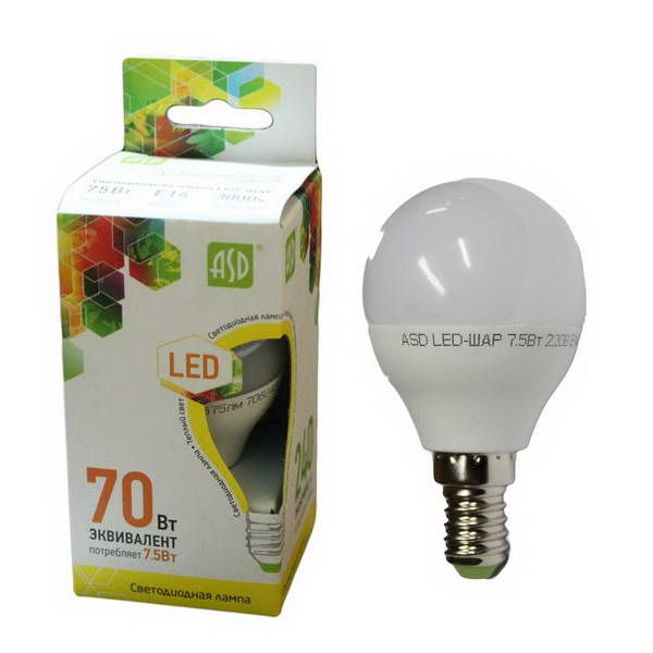 Лампа диод ASD Е14-7,5W 3000К 675Лм шарик Р45