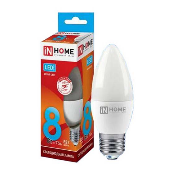 Лампа диод IN HOME Е27-8W 4000К 600Лм свеча