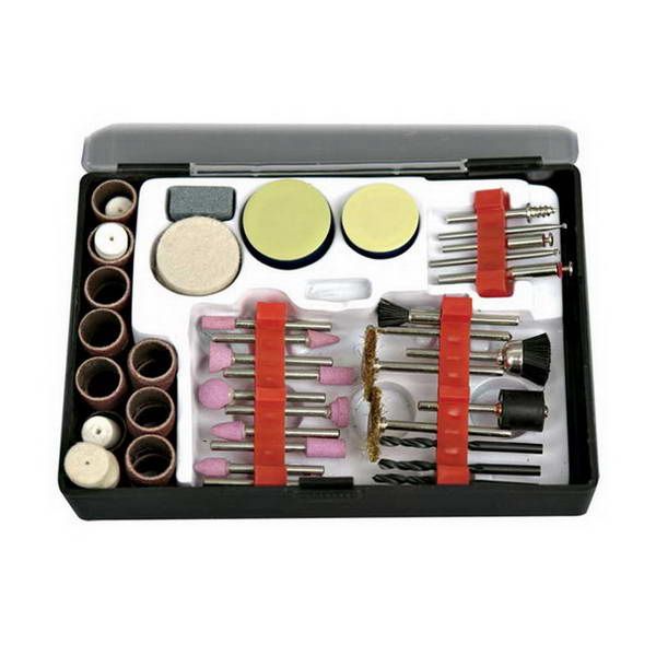 Набор включает в себя 100 различных насадок и приспособлений для граверов. Полировальная насадка и различные полировальные принадлежности, шлифовальные диски и круги, шарошки, приспособления для гравировки стекла, пластика и металла, сверла, щетки.