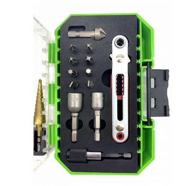 Набор отверточных насадок и сверл 18 предметов с ключом с храповым механизмом Набор предназначен для закручивания винтов и болтов и сверления отверстий В набор входит: Ключ с храповым механизмом: 1 шт. Биты 8 шт.- PH1 PH2 PH2 PH3 T30 V5 SL5 T25 Головка с шестигранным хвостовиком 2шт-8мм и 10мм Зенкер 1 шт. Сверла с шестигранным хвостовиком HSS диаметр: 1,5 мм, 2,0 мм, 2,5 мм, 3,0 мм Сверло ступенчатое 3-13 мм