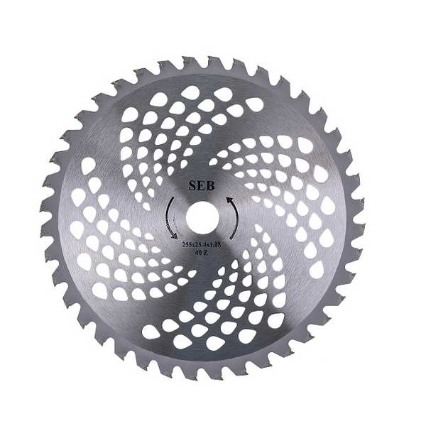 Нож 40 зубов для бензотриммера, посадочное отверстие 25.4 мм, наружный диаметр 255 мм, толщина 1.25 мм. Зуб с победитовыми напайками. Используется для кошения жесткой травы и мелкого кустарника. Применяется для косилок с опцией установки ножа. За счёт дополнительных отверстий по всей ширине ножа нагрузка на редуктор триммера при работе уменьшается.