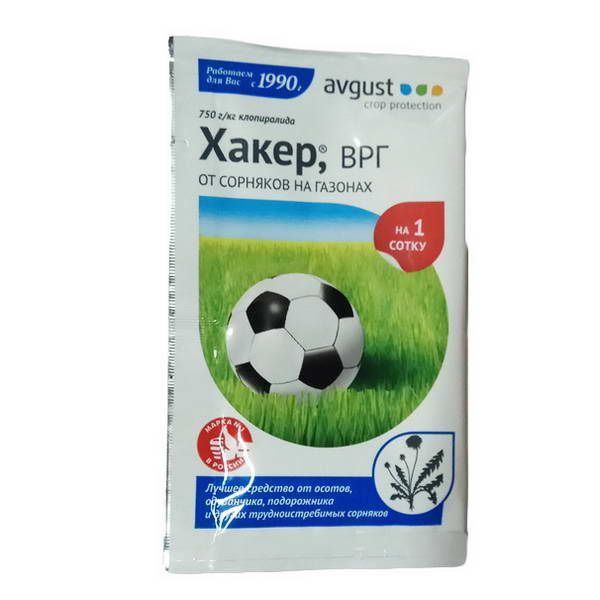 Содержит повышенную концентрацию действующего вещества и с легкостью уничтожает двудольные сорняки, такие как одуванчик, осоты, подорожник, щавель, лютик и другие, при этом не повреждает злаковую газонную траву. Препарат разводится в пропорции 2,5 г (одна упаковка) на 5 л воды, приготовленной жидкостью можно опрыскать 100 кв.м. газона. Обработки проводят после укоса, по участкам с проросшими сорняками. Поглощаясь листьями, Хакер переносится к точкам роста, корням и корневищам, нарушая процесс деления клеток и развитие растения. Через несколько дней листья сорняков скручиваются и желтеют, по истечении 1-3 недель наступает их окончательная гибель.