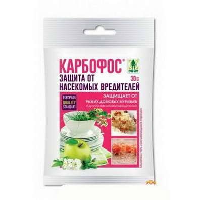 Используется для борьбы с многими сосущими вредителями: медяницы или тли, гусеницами яблонной плодожорки и листогрызущих вредных бабочек, а также с личинками пилильщиков. Имеет неприятный и сильный запах, который быстро исчезает после опрыскивания. «Карбофос» хорошо соединяется с водой и образует стабильную эмульсию. Он густеет при низкой температуре, не теряя при этом своих токсических свойств.