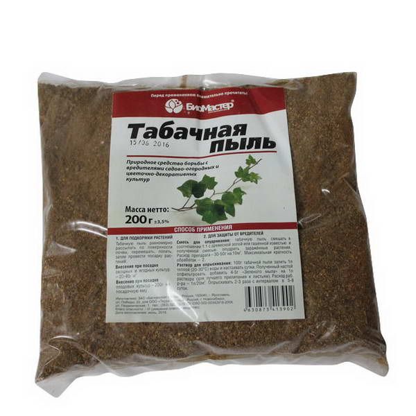 В составе табачной пыли присутствует до 1% никотина, который эффективен как средство борьбы с вредителями: медяницами, тлей, муравьями, листовертками и другими вредителями.