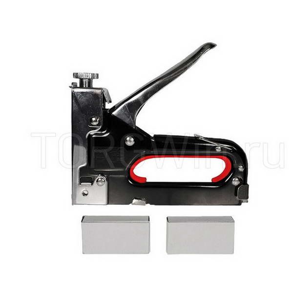 Степлер металлический черный применяется для забивания скоб (от 6 до 14 мм) в дерево, ДСП, ДВП, фанеру и другие строительные материалы на основе древесины. Конкретно служит для закрепления обивки мебели, проволочной сетки, укрепления плакатов, строительства теплиц и т.п. Оснащен регулировочным винтом для возможности оптимальной настройки силы удара. Степлер изготовлен из стали. В комплект входит 2 упаковки со скобами (6 и 8 мм).
