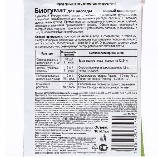 Биогумат для рассады — удобрение в удобной упаковке с помпой-распылителем. Предназначено для подкормки саженцев, рассады цветочных, овощных и ягодных культур. Экологически безопасно, содержит необходимые для активного роста и развития растений гуминовую кислоту, фосфор, азот, калий. Средство полностью готово к применению, не требует разведения. Обработку проводят в пасмурную погоду, оберегая растения от попадания прямых солнечных лучей. Перед применением необходимо взболтать.